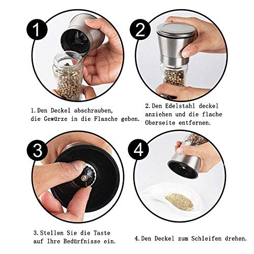 👍【Hochwertige Materialien】 Die Verwendung von hochwertigen 304 Edelstahl-Schleifköpfen und verdickten Glasflaschen hat eine gute Korrosionsbeständigkeit, erzielt gute Lagereffekte und ermöglicht es Gewürzen, länger zu halten.